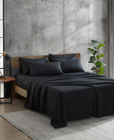 IT'S ALL IN THE . Details: Sheet set 5-Piece sheet set includes one twin flat sheet, one twin fitted sheet, and three pillowcases Fitted sheet features branded all-around elastic and cell phone pockets on each side Super-soft to the touch Features a topical cooling finish for a comfortable night's sleep Wrinkle-resistant Twin flat sheet: 66" W x 96" L, Twin fitted sheet: 39" W x 75" L + 16" deep pocket, standard pillowcase(s); 30" W x 20" L Full flat sheet: 81" W x 96" L, full fitted sheet: 54" W x 75" L + 16" dee pocket, standard pillowcase(s); 30"Wx20"L Queen flat sheet: 94" W x 102" L, queen fitted sheet: 60" W x 80" L + 16" deep pocket, standard pillowcase(s); 30" W x 20" L King flat sheet: 112" W x 102" L, king fitted sheet: 78" W x 80" L + 16" deep pocket, king pillowcase(s); 40" W x 20" L Standard 100 By OEKO-TEX® Certified 100% recycled polyester Machine wash Imported | Kenneth Cole | Solution Solid Sheet Set in Black, Size: King