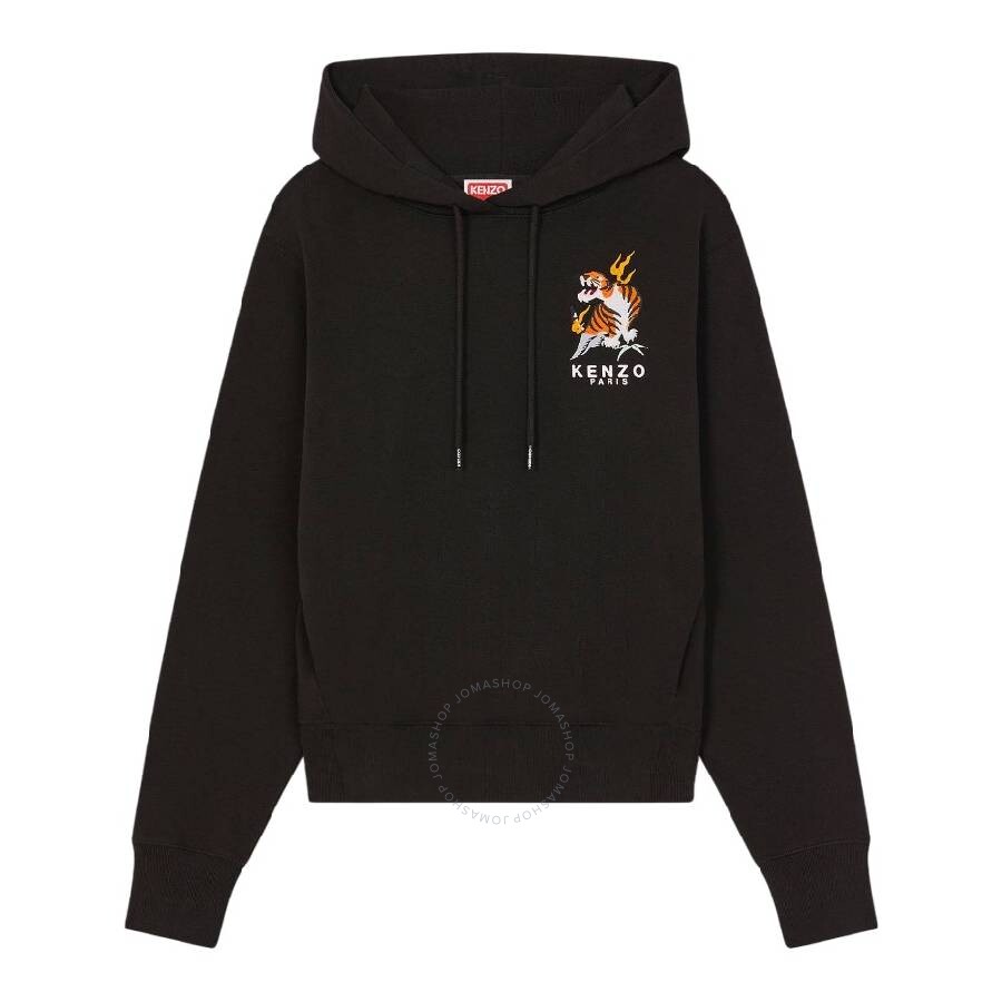 Kenzo Ladies Tops. Fashion category: Cardigans & Sweaters. SKU: FE52SW1214ME-99J. Color: Black. Kenzo Embroidered Tiger Long Sleeve Sweater. This sweater features an embroidered Year of the Dragon brushed-fleece design, long sleeves, a hood with a drawstring, Tiger embroidery on the chest, a dragon representing the number 8 on the back, seam pockets at the sides and ribbed hem and cuffs. 99% cotton, 1% elastane. Made in Portugal.