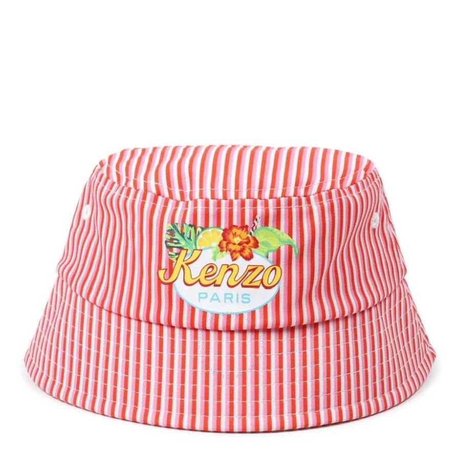 Kenzo Girls Hats. Fashion category: Hats. SKU: K60400-12P. Color: Ivory. Kenzo Girls Striped Pattern Bucket Hat. This hat features a flat crown, a dropped narrow brim, a vertical stripe pattern, logo print on the front, eyelet detailing, full lining, and a pull-on style. Cotton 100%.