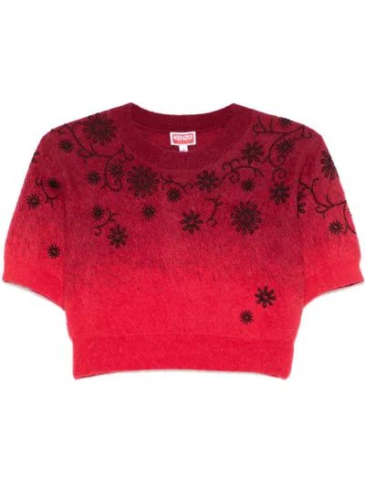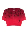 crew neck | cropped length | ribbed cuffs | ribbed hem | short sleeves | brushed finish | crimson color | knitted construction | Marguerite bead embellishment | Floral embroidery
