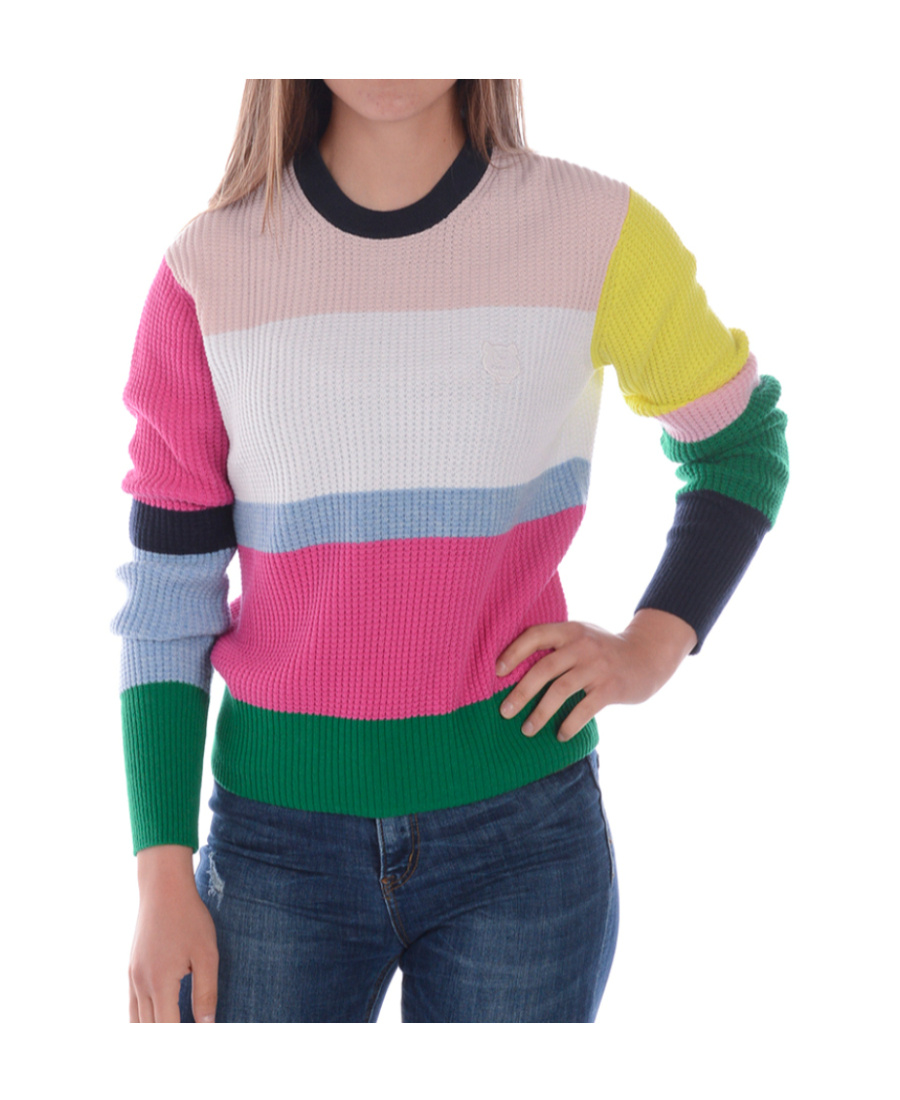 Multi-color spliced pullover, round collar, long sleeves, rib details, straight hem.