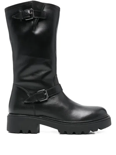 black leather strap buckle fastening lug sole pull-on style mid-calf height