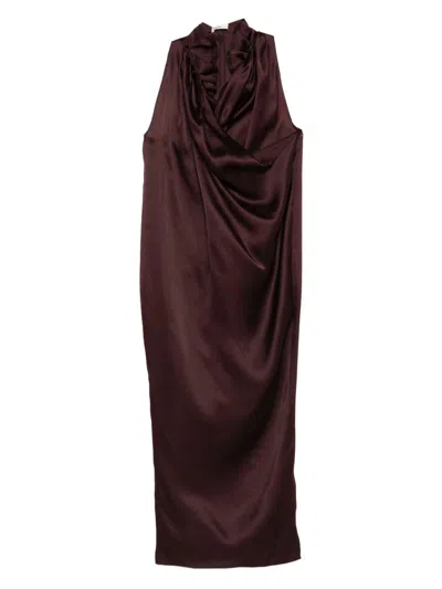 Brown silk dress. Draped line. Pleated collar. Raw-cut profiles. Split at the back. 100% silk MADE IN USA