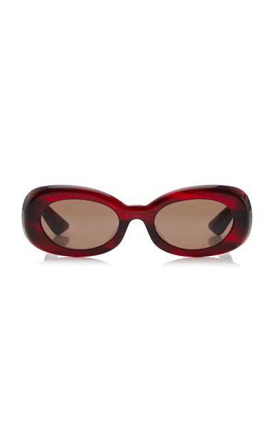 Made in collaboration with legendary eyewear brand Oliver Peoples; this collection reimagines vintage forms through a shared dedication to distinctive yet enduring style; exquisite materials; and unparalleled craftsmanship.Handcrafted in Italy; these boldly formed sunglasses look to the cool confidence of the 1990s. The oval silhouette gains dimension from its rounded profile. Tipped by alternating; hand-inlaid logos; the broad temples feature shooting corewire inspired by the hardware of KHAITE handbags. Each pair includes a signature lipstick red case and a drawstring pouch that doubles as a lens cloth.