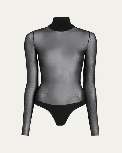 Seen as part of several fall '24 runway ensembles, this bodysuit features stitched details at the shoulder seams and sides of the waist in allusion to princess seams, with an opaque turtleneck to visually underscore the otherwise sheer style. Snap closure Turtleneck Long sleeves Sheer Lined gusset 72% viscose, 27% polyamide, 1% elastane Dry clean Made in Italy Designer Clothing