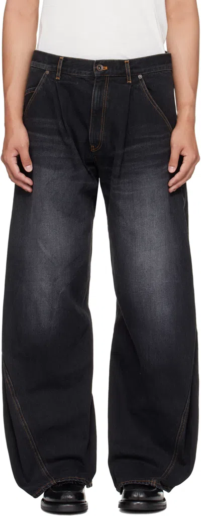 Khoki curved-leg jeans by made from faded black cotton denim. Features front button and zip closure, belt loops, multiple pockets, and curved side seams.