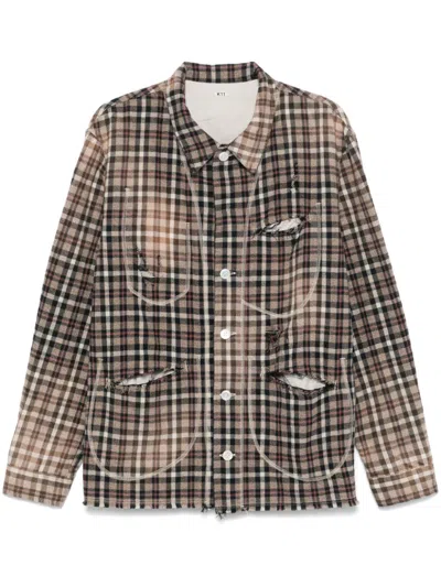 black/sand beige/multicolour cotton flannel check pattern spread collar long sleeves buttoned cuffs slip pocket to the front distressed finish fringed hem