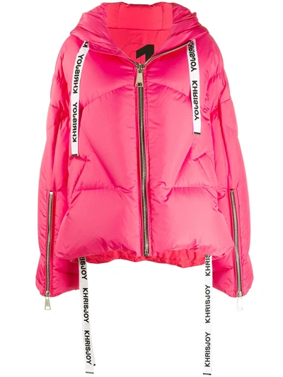Pink feather down logo drawstring jacket from KHRISJOY featuring padded, a drawstring hood, a front zip fastening, side pockets, long sleeves and zipped cuffs.