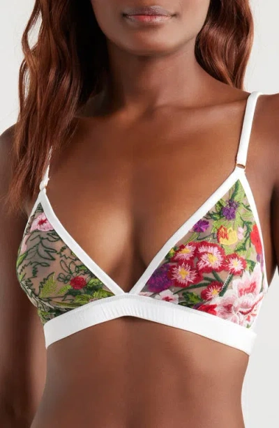 Sheer mesh brightened with colorful wildflower embroidery make this triangle bralette a must-have for your lingerie drawer. 75% polyester, 20% nylon, 5% spandex Hand wash, line dry Imported