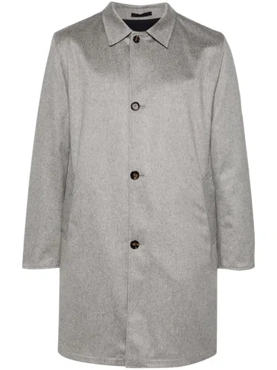 heather grey cashmere mélange effect reversible front button fastening spread collar long sleeves two side welt pockets central rear vent straight hem