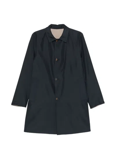 Single-breasted coat with blue button closure, pointed collar, and long sleeves. Comes with a dust bag for extra protection.