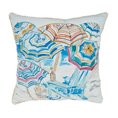 Kick back and relax in your outdoor space with this Colorful Beach Umbrellas Outdoor Pillow! This pillow will have you feeling the sand between your toes and the sun on your skin. Pillow measures 20L x 20H in. Crafted of polyester with polyester fill insert Printed fabric design with embroidered details Hues of blue, white, pink, orange, and tan Looped edges Solid white reverse Zipper closure Safe for outdoor use Care: Spot clean. This item is available at Kirklands.com only, not available in stores. Please note: this item cannot be shipped to APO/FPO addresses. | Colorful Beach Umbrellas Outdoor Pillow, multicolor, 20L x 20H , Polyester | Kirkland's Home