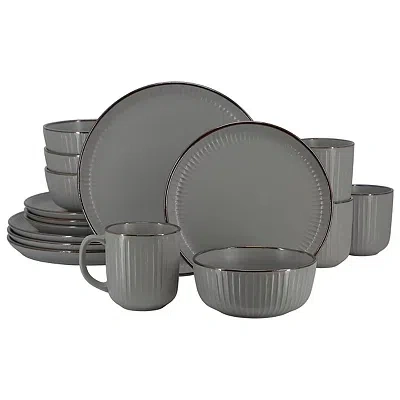 Make your dining experience feel sophisticated with this Dark Gray Leo Stoneware 16-pc. Dinnerware Set. Detailed with a sleek finish and subtle texture, this dinnerware boasts a contemporary yet timeless design that is perfect for any occasion. Set includes four (4) dinner plates, four (4) salad plates, four (4) cereal bowls, and four (4) mugs Dinner plates measure 10.5 in. in diameter each Salad plates measure 8.6 in. in diameter each Cereal bowls measure 6 in. in diameter each Mugs measure 3.6 in. in diameter each; holds up to 12 oz. Crafted of stoneware Contrasting trim finish Hues of gray Food and microwave safe Care: Dishwasher safe. This item is available at Kirklands.com only, not available in stores. Please note: this item cannot be shipped to APO/FPO addresses. | Dinnerware Set, 16 Piece, Gray, 12 oz, Stoneware | Kirkland's Home