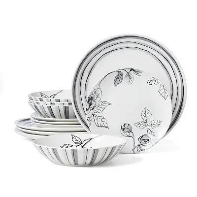 The Sketchbook Floral 12-pc. Dinnerware Set will bring a kind of effortless beauty to your table setting. Monochromatic hues and blooming flowers give it a classic look that's perfect for any meal. Set includes four (4) dinner plates, four (4) salad plates, and four (4) bowls Dinner plates measure 10.5 in. in diameter each Salad plates measure 7.5 in. in diameter Bowls hold up to 16 oz. each Crafted of porcelain Floral design Hues of white and black Food and microwave safe Care: Dishwasher safe. This item is available at Kirklands.com only, not available in stores. Please note: this item cannot be shipped to APO/FPO addresses. | Dinnerware Set, 12 Piece, White/Black, 10.5, Porcelain | Kirkland's Home