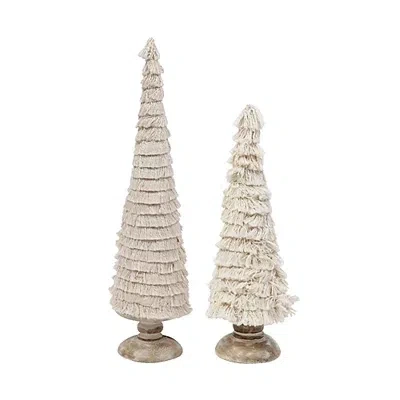 Bring natural, boho charm to your winter wonderland with the set of Fringe Embellished Christmas Trees. Their rich textures will add a whimsical touch to your mantel or shelf. Set includes two (2) trees Large tree measures 21.7H x 5.1 in. in diameter Small tree measures 15H x 3.9 in. in diameter Crafted of cotton Christmas tree designs Fringe texture Wooden stands Hues of ivory, tan, and brown Tabletop use Care: Dust with a soft, dry cloth. This item is available at Kirklands.com only, not available in stores. Please note: this item cannot be shipped to APO/FPO addresses. | Fringe Embellished Christmas Trees, Set of 2, Brown/Ivory, 21.7H x 5.1 , Cotton/Wood | Kirkland's Home