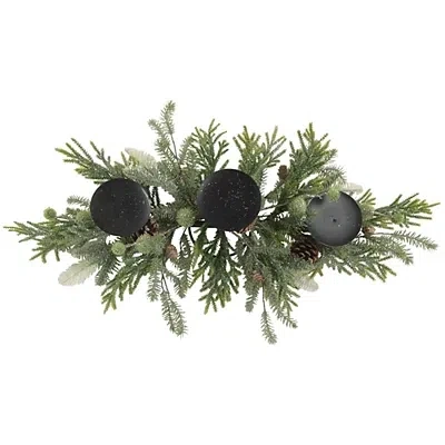 Add some holiday greenery to the foyer table this winter season! You’ll love the mix of refreshing elements in this Frosted Evergreen Pine Candle Centerpiece. Centerpiece measures 26L x 10W x 8.5H in. Crafted of metal and artificial materials Features a mix of frosted pin branches and pinecones Includes matte candlesticks Hues of green, black, and brown Accommodates three (3) candles; candles not included Not suggested for outdoor use Care: Dust with soft, dry cloth. Item may need to be re-shaped when removed from the box. Contact your local Kirkland's store for availability. Quantities and selection may vary by location. | Frosted Evergreen Pine Candle Centerpiece, Green/Brown, 26L x 10W 8.5H , Metal | Kirkland's Home