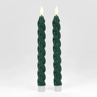Bring an unexpected twist to your Christmas centerpiece with the set of LED Green Twisted Taper Candles! These flameless candles will add a whimsical glow to your winter wonderland. Set includes two (2) candles Candles measure 8.7H x 0.8 in. in diameter each Twisted design Unscented LED design Hues of green Timer settings: 6 hours on, 18 hours off Each candle requires two (2) AAA batteries; batteries not included Care: Dust with a soft, dry cloth. Contact your local Kirkland's store for availability. Quantities and selection may vary by location. WARNING: Cancer and Reproductive Harm - For more information go to www.P65Warnings.ca.gov . | LED Green Twisted Taper Candles, Set of 2, Green, 8.7H x 0.8 | Kirkland's Home