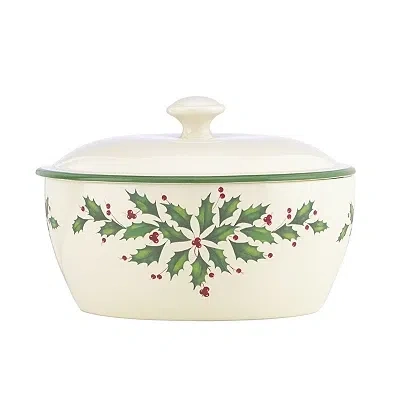 The Lenox Holiday Covered Casserole Dish will become a seasonal staple for any host or home chef. Detailed with beautiful holly motifs, this baking dish is perfect for serving large dinner parties. Dish measures 3.75H x 7.25 in. in diameter Crafted of porcelain Features holly motifs Hues of ivory, green, and red Food, microwave, and oven safe Care: Dishwasher safe. This item is available at Kirklands.com only, not available in stores. Please note: this item cannot be shipped to APO/FPO addresses. | Lenox Holiday Covered Casserole Dish, Green/Red, 3.75H x 7.25 , Porcelain | Kirkland's Home