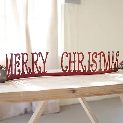 This Merry Christmas Tabletop Word Runner is a great way to offer a warm greeting to your holiday guests! It will look great on your mantel or favorite table! Word runner measures 33.25L x 3.5W x 5.75H in. Crafted of metal Features the words "Merry Christmas" in red Weathered finish Hues of red and black Stands on its own Care: Dust with a soft, dry cloth. This item is available at Kirklands.com only, not available in stores. Please note: this item cannot be shipped to APO/FPO addresses. | Merry Christmas Tabletop Word Runner, Red, 33.25L x 3.5W 5.75H , Metal | Kirkland's Home