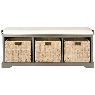 The Gray Upholstered Jeanette Storage Bench is the perfect perch for an entryway or mudroom. Its three removable woven baskets provide no-fuss storage, and a white cotton cushion completes the look with comfort and farmhouse charm. Bench measures 47W x 16D x 20H in. Crafted of pine wood, MDF, and wood veneer Gray finish Features a white cotton seat cushion filled with high-density foam Includes three (3) wicker storage baskets Cubbies measure 14W x 14.5D x 13H in. Weight: 48 lbs. Weight capacity: 175 lbs. Assembly required Not intended for commercial use Care: Spot clean. This item is available at Kirklands.com only, not available in stores. Please note: this item cannot be shipped to APO/FPO addresses. | Upholstered Jeanette Storage Bench, White/Gray, 47W x 16D 20H , Wood/Upholstered | Kirkland's Home