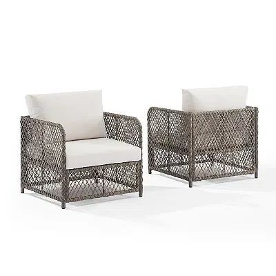 Complete your outdoor escape with these Gray Wicker Outdoor Chairs with Cushions! Their plush, supportive cushions create a cozy retreat for unwinding al fresco. Crafted with handwoven, weather-resistant wicker, it offers lasting durability with coastal charm. Set includes two (2) chairs Each chair measures 29.25W x 28.5D x 33H in.; seat height: 16.25 in. Crafted of metal and PE wicker Stone gray finish Upholstered in high-performance polyester and filled with high-density foam Features handwoven wicker design UV resistant all-weather resin wicker Weather-resistant powder-coated steel frame Cushion covers resist sun fade and abrasion Moisture-resistant high grade cushion cores 4.25 inch thick seat and back cushions Adjustable levelers on legs Weight capacity: 250 lbs. Assembly required Safe for outdoor use Care: Clean PE wicker with a mild soap solution, scrub with a sponge, rinse with cold water and dry completely. Removable cushion covers are machine washable. Cover when not in use. Store properly during inclement weather. This item is available at Kirklands.com only, not available in stores. Please note: this item cannot be shipped to APO/FPO addresses. | Wicker Outdoor Chairs with Cushions, Set of 2, White/Gray, 29.25W x 28.5D 33H , Metal/Rope | Kirkland's Home