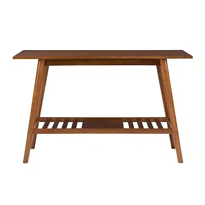 The Brown Wood Slatted Bottom Shelf Console Table is the perfect way to add midcentury modern flair to your entryway. Display all your lamps, books, and décor on this stunning piece! Table measures 47L x 18W x 30H in. Crafted of rubberwood, solid wood, wood composite, and birch veneer Brown finish Midcentury modern style Features a bottom slatted shelf Rectangular shape Top weight capacity: 50 lbs. Shelf weight capacity: 20 lbs. Item weight: 31.97 lbs Assembly required; see Info & Guides below to view or print assembly instructions. Not intended for commercial use Care: Dust with a soft, dry cloth. This item is available at Kirklands.com only, not available in stores. Please note: this item cannot be shipped to APO/FPO addresses. WARNING: This product can expose you to chemicals including DEHP which is known to the state of California to cause cancer and birth defects or other reproductive harm. For more information go to www.P65Warnings.ca.gov . | Wood Slatted Bottom Shelf Console Table, Brown, 47L x 18W 30H | Kirkland's Home