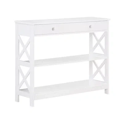The modern, angular design of this White X-Frame 2-Shelf Console Table will give your space a fresh update. Featuring clean lines and plenty room for display and storage, it will perfectly complete any room! Table measures 39.5L x 12W x 31.5H in. Crafted of wood composite Painted white finish Features two (2) drawers and two (2) shelves Decorative X side design Weight: 42 lbs. Shelf weight capacity: 20 lbs. Assembly required Not intended for commercial use Care: Dust with a soft, dry cloth. This item is available at Kirklands.com only, not available in stores. Please note: this item cannot be shipped to APO/FPO addresses. | X-Frame 2-Shelf Console Table, White, 39.5L x 12W 31.5H , Wood | Kirkland's Home
