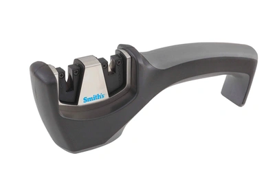 One of the most versatile of the Pull-Thru Knife Sharpeners available from Smith's is the Carbide/Ceramic Pull-Thru Knife Sharpener. This sharpener uses pre-set carbide blades and crossed ceramic stones to bring your knifes blade to razor sharpness. The triangular shaped ceramic stones can be used on either straight or serrated edges. Like the other Pull-Thru sharpeners, it has an ergonomically designed, soft grip handle and non-slip rubber feet for comfort and steadiness when sharpening. The Carbide/Ceramic Pull-Thru Knife sharpener works best when trying to sharpen very dull or damaged blades to razor sharpness, but can also be used to maintain the edge on already sharp knives.