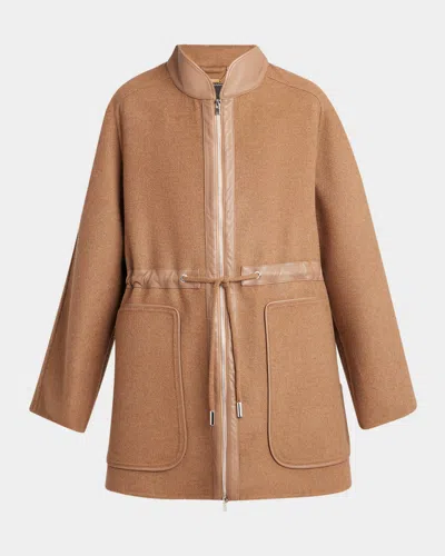 Kiton brushed wool parka jacket featuring leather trim and a drawstring cinched waist Stand collar; twoway zip front Long sleeves Hip patch pockets Straight fit Hem falls below the hip Virgin wool Made in Italy