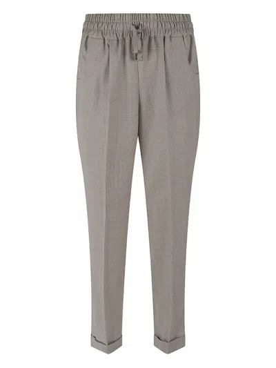beige check pattern elasticated waistband two rear welt pockets turn-up hem drawstring fastening