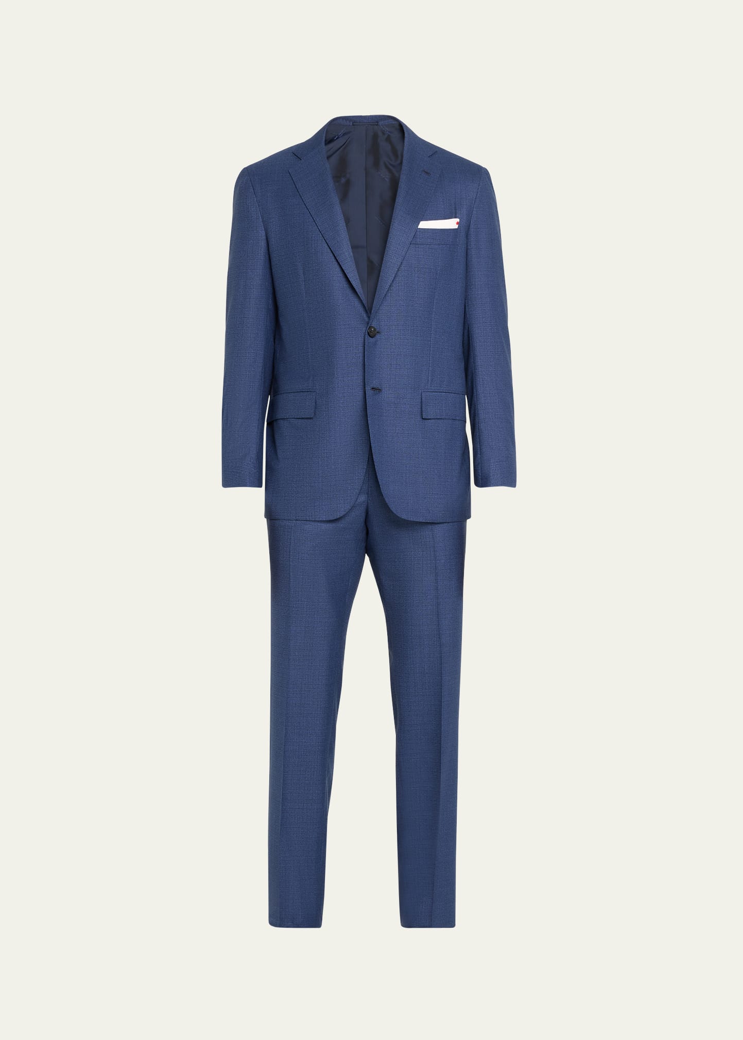 Kiton suit in micro check Notched lapels Two-button closure Chest welt pocket; side flap pockets Unfinished sleeves Double-vented back Flat-front trousers Straight legs Virgin wool Made in Italy