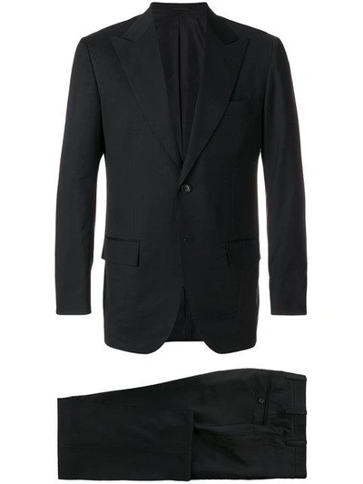 Black wool single breasted suit from Kiton featuring peaked lapels, a front button fastening, long sleeves, side flap pockets and a straight leg.