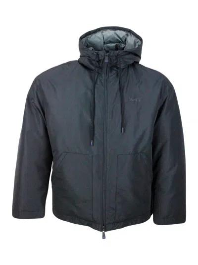Knt down jacket in technical fabric with hood with drawstring with smooth exterior and boudin quilted interior in contrasting color. small matching logo*Import tax/duty will be calculated at checkout (If applicable)