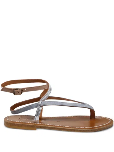 KJACQUES presents a refined flat sandal that marries simplicity with sophistication. This design features a smooth leather sole accented by visible white stitching, while the delicate straps include a metallic silver toe loop and an adjustable ankle strap with a subtle buckle. The natural brown leather accents provide a harmonious balance, making it the epitome of understated luxury for summer outings. Brand - KJACQUES Product Type - Shoes > Sandals Material - Leather cow Style - Minimalist, Flat Gender - Women