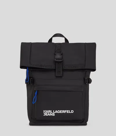 Made From Coated Technical Leather, This Backpack Features A Spacious Roll-top Design Secured With A Zip And Buckle Closure. Equipped With A Top Grab Handle And Adjustable Shoulder Straps, It Combines Practicality With Style. The Front Pocket, Adorned With A Bungee Cord Puller And A Striking Karl Lagerfeld Jeans Logo, Adds A Statement Touch.