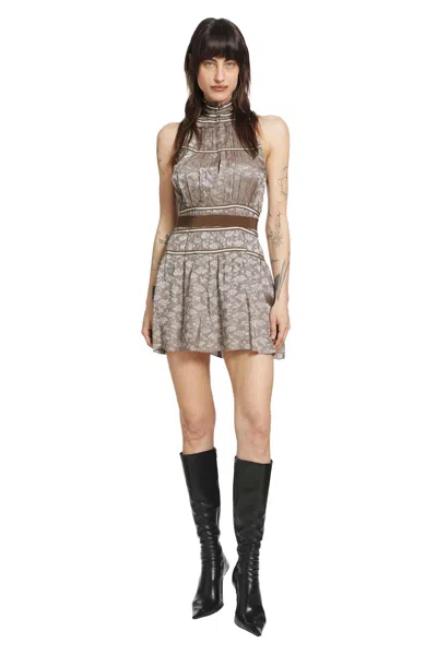 The Freya Dress reflects Charlotte Knwls' commitment to intricate craftsmanship and subtle, considered detailing. Its smocked collar, ruched construction, and signature grosgrain ribbon exemplify the brand's ability to blend refined femininity with modern, wearable elegance.brownfloral viscose jacquardsmocked collarruchedhook-and-eye closuresleevelessgrosgrain waist ribbon