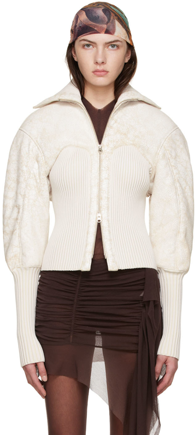Insulated paneled lambskin and rib knit stretch viscose jacket. Distressing throughout. · Spread collar · Two-way zip closure · Partially lined Supplier color: Crackled white