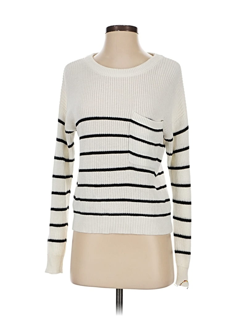 Korye Pullover Sweater, Size: X-Small. Item Details: White, Stripes Pattern, Boatneck, Long Sleeve, Women's Tops, Acrylic/Cotton