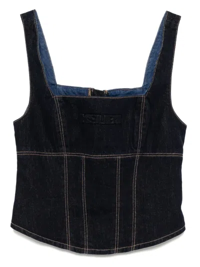 navy blue rear zip fastening square neck sleeveless embossed logo to the front