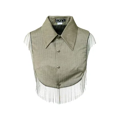Double the drama, double the slay. This cropped reversible vest is a head-turner, featuring cascading metallic fringe and a two-tone twist—wear it deep green for bold polish or flip to sage for an earthy glam vibe. Designed with a crisp shirt collar, rescued metallic buttons, and an open side cut connected by a sleek adjuster strap for an unexpected peek. Style it solo with high-rise jeans for rooftop nights, or layer it over a fitted turtleneck to play with contrast and texture. Statement piece? Always. Basic? Never. Main fabric: 100% rescued polyester tergal Dry clean only or spot clean with care Handle fringe with love – it’s precious