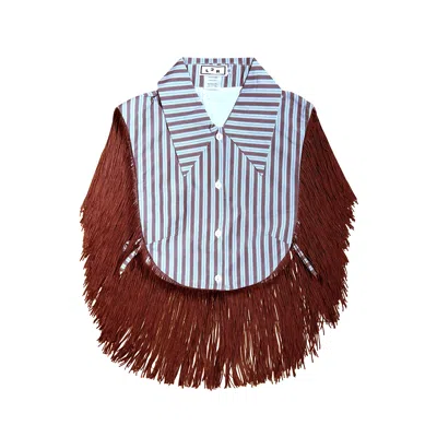 A western nod meets downtown cool in this bold, double-take-worthy piece. This reversible cropped vest features crisp shirt collars, rescued buttons, and a dramatic halo of long chocolate silk fringe that swings with every move. One side features a retro striped brown cotton poplin, the other a crisp white cotton canvas—because yes, your outfit can change its mind. An adjuster strap at the open sides keeps the front and back in perfect harmony, leaving the sides cheekily open for a touch of flirt and freedom. Dress it up over a slip dress, or down with baggy denim. Either way, it’s the fringe moment your wardrobe’s been waiting for. 100% rescued cotton (body) 100% silk fringe (deadstock) Spot clean recommended Steaming or ironing Store hanging or flat to preserve fringe shape Handmade in limited quantities from deadstock materials