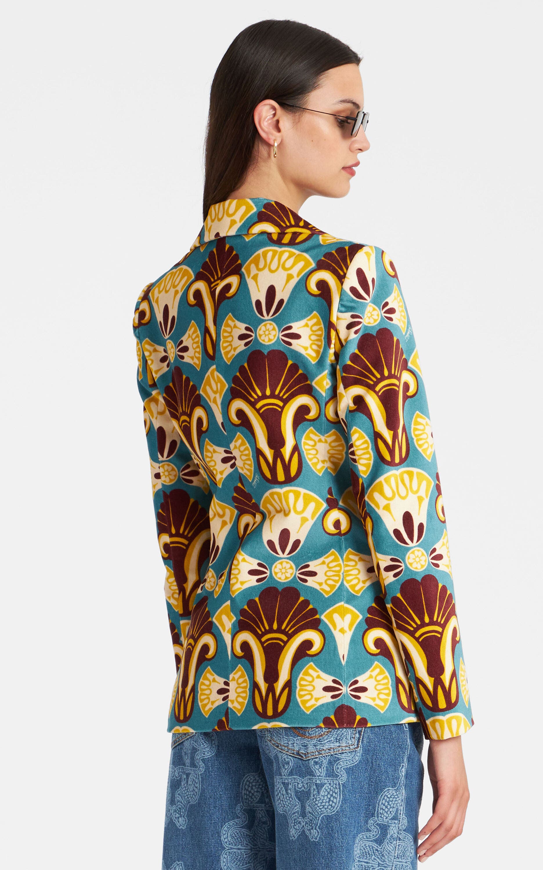 If the next Bond is a woman, she’s wearing this blazer. An updated take on a seventies silhouette, the 24/7 Jacket has a structured shoulder and slightly tapered waist for a fiercely flattering fit. Cut in sumptuous Italian velvet cotton in our triumphant Dendera print, wear this beauty over a black top and trousers to bring a pop of color to your minimalist office ensemble or clash with our printed 24/7 Pants for a badass maximalist moment. Structured Shoulder Large Pockets on the Lapel Contrast Lining Faux Horn Buttons Composition: 100% Velvet cotton 100% Made in Italy The model is 181 cm tall and wears a size S Garment length: 65cm