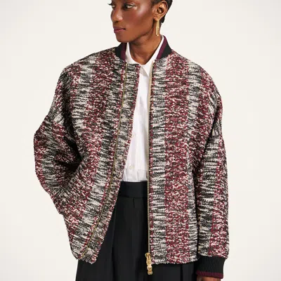 La DoubleJ New Fall 2025: VIP Early Access gend Brooklyn Bomber Multicolor Red & Black. Debbie Harry called - she wants her bomber back. With a slouchy but structured fit with a slightly high-low hem and ribbed knit collar and cuff, this more tailored take on a classic jacket shape is how Italians do oversized outerwear. We love it in this sumptuous bouclé lurex, which throws on as a statement for day or the perfect finish for a winter wedding or evening soiree. The decadence is in the details on this beauty, bella - note the intricate scarab detail on the zipper.