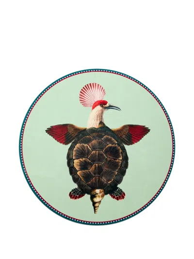 La DoubleJ Placemats & Runners gend Disk Placemat Turtlair Salvia. The best table settings start with a stellar foundation. These highly decorative Disk Placemats made from compressed, durable, natural materials make for a stunning statement on any table. Adorned with the sweet and striking Turtlair from our Fantastic Creatures Collection with surrealist artist, Beto Val, this placemat not only elevates your tablescape, but your energy as well, serving as a reminder that there is growth and expansion even in stillness.