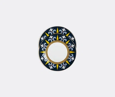 Designed by La DoubleJ in collaboration with Italian ceramic giants Ancap, this colorful dessert plate set offers a pair of fine porcelain plates decorated in the brand's bold 'Levante' motif. Named after the winds that blow through the Bay of Naples, the two plates are each finished off with an 18k gold trim for a striking and memorable table accent that can be paired with other pieces by the brand.