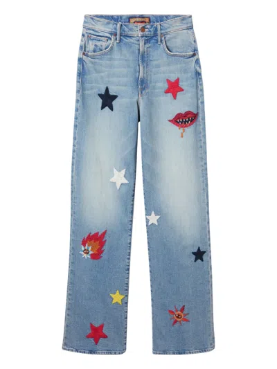 La DoubleJ LDJ x Mother Pre Access gend The Maven Sneak Jeans Star Of The Show Blue. Blending Italian maximalism and California cool, La DoubleJ and Mother have joined forces to create some chicest-leg-lengthening denim for their Ciao Mamma! collaborative collection. These super high-waisted stunners feature a loose, wide leg fit and arrive adorned with vibrant embroidered stars across them, adding a little retro radiance to their figure-flattering form.