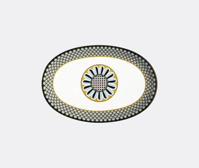 Part of a collection of porcelain La DoubleJ, the 'Odysseus' oval platter brings a classical touch to tables. A geometric language unfolds throughout the design in tones of golden yellow and midnight blue. A deep patterned border of tessellated fish-scales draws the eye to the center. A solar design symbol sits in the heart of the piece. Hand-finished with an 18k gold rim, this richly decorated dish can be introduced to table set-ups as a striking statement or layered with tableware from the 'Napoli' and 'Odysseus' lines for the full effect. Not dishwasher safe.