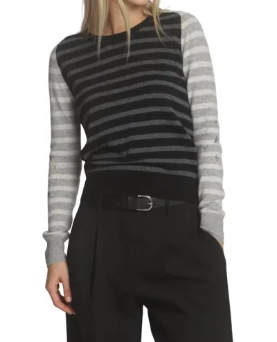 Experience the perfect blend of comfort and style with this trendy crew neck sweater, designed to effortlessly elevate your wardrobe. Pair it with your favorite denim and loafers for the perfect look.Mixed stripe saddle shoulder crew with faded metallic stars faintly printed on the sleeve. Long sleeve. Model is 5'9, wearing size small. Slim fit. 100% Cashmere. Hand wash or dry clean.