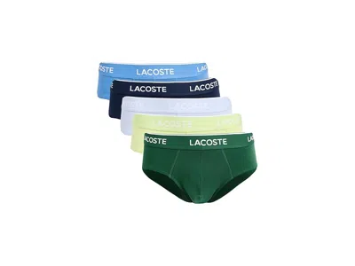 Lacoste 5-Pack Cotton Stretch Briefs - Men's Underwear : Blue/Green : The Lacoste 5-Pack Cotton Stretch Briefs delivers everyday comfort with a sporty edge. Designed in a regular fit, each brief is crafted from soft stretch cotton jersey fabric that moves with you while maintaining shape. The elasticized waistband is flexible and features signature detailing. ; Sold as a pack of five. ; Mid-rise silhouette. ; Pull-on style. ; 95% cotton, 5% elastane. ; Machine wash, line dry. ; Imported. ; If you're not fully satisfied with your purchase, you are welcome to return any unworn, unwashed items in the original packaging with tags and if applicable, the protective adhesive strip intact. Note: Briefs, swimsuits and bikini bottoms should be tried on over underwear, without removing the protective adhesive strip. Returns that fail to adhere to these guidelines may be rejected. | Lacoste 5-Pack Cotton Stretch Briefs Men's Underwear Blue/Green : L (EUR 6), Cotton/Elastane/Jersey