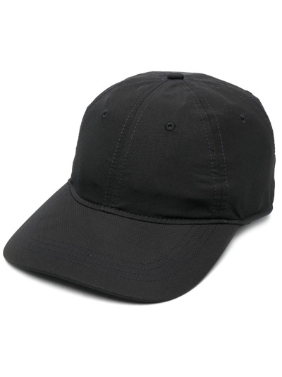 Lacoste Baseball Cap In Black A six panel baseball style hat with a hard stiff front peak and an adjustable Lacoste logo embossed metal clasp fastening on the reverse in black with the signature Lacoste pinch tag logo woven into the strap in green and white. The signature Lacoste Crocodile logo is embroidered on the right of the cap in green red black and white. Top stitched detail on the peak in black with embroidered eyelet detail on top for ventilation in black. 100% Cotton.